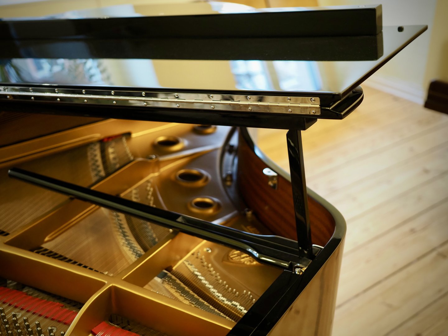 Uitrusting:Sostenuto, Deckelstütze, Klappenbremse, Chrom Ausführung, Mahagoni Rim innen, kleine zusätzliche Deckelstütze, breite Rollen