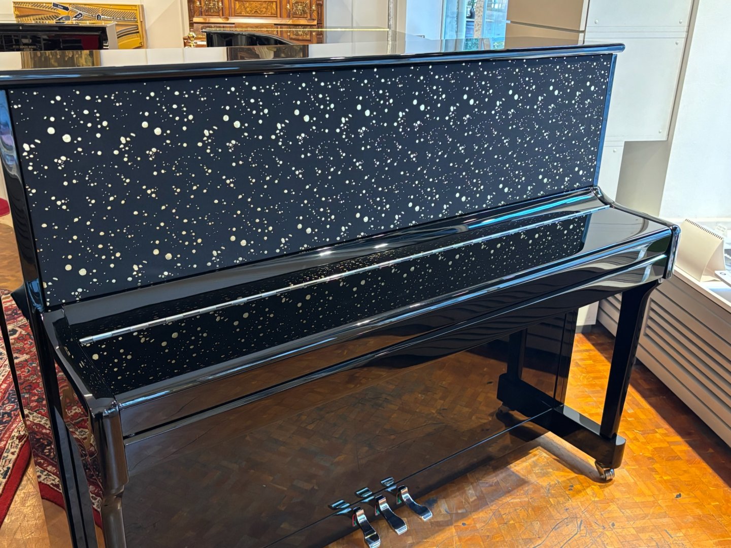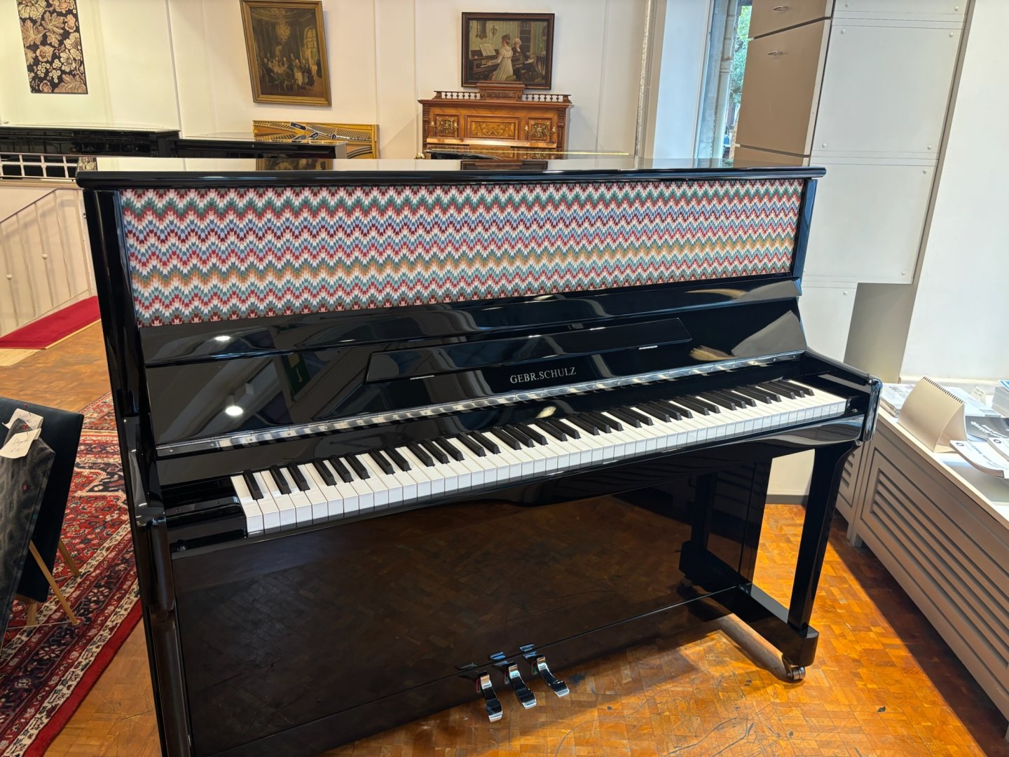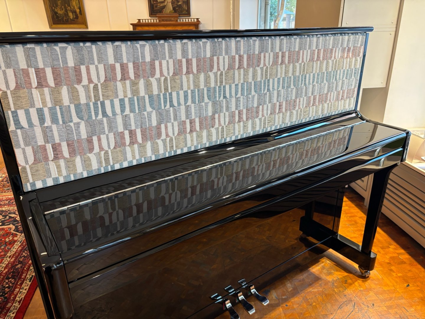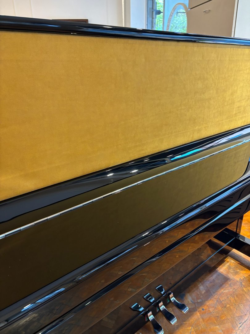 Ein neues Klavier mit Stoffbespannung, in unserer Fertigung in Mainz hergestellt. Ober- und Unterrahmen sind mit Stoff bezogen und können individuell auf Kundenwunsch angepasst werden. Durch diese Technik wird das Klavier nicht nur zum optischen Statement. Das Klangerlebnis ist viel intensiver, da die Klangabstrahlung zum Spieler direkter ist.