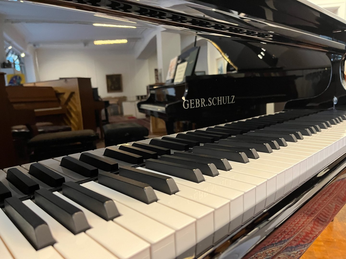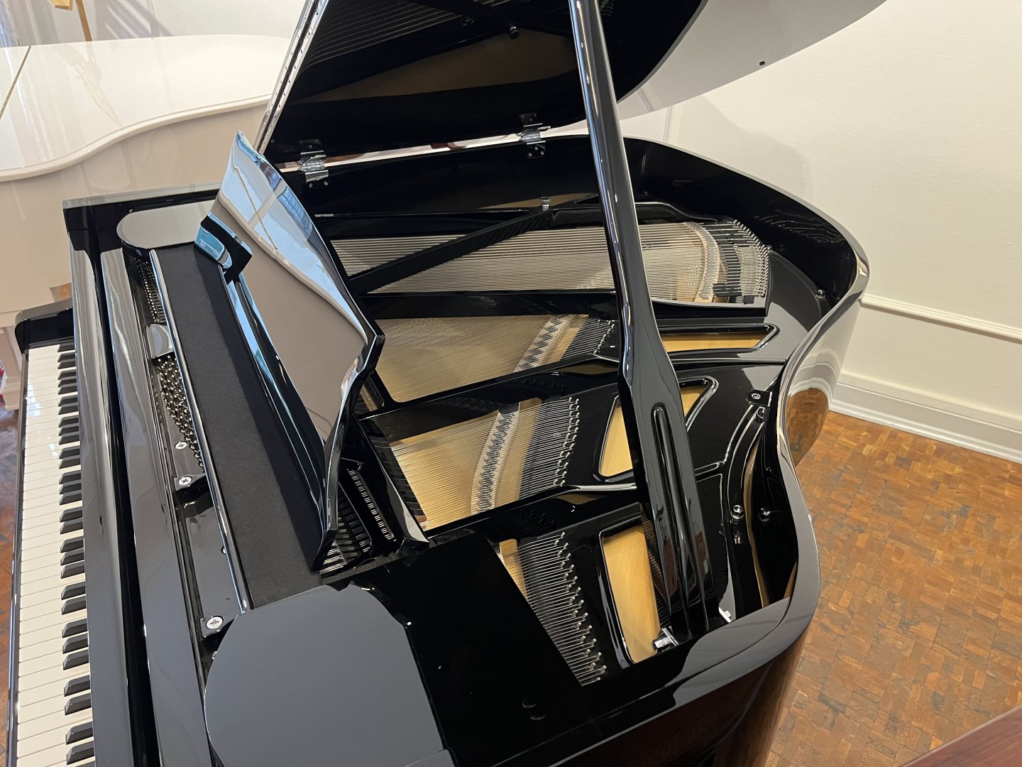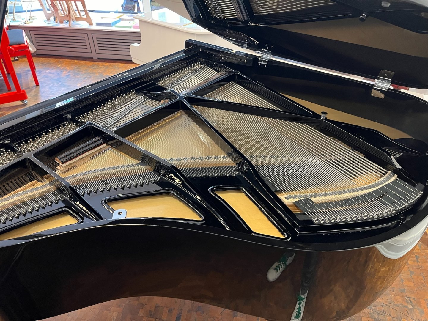 Neuer Flügel mit schwarz lackiertem Gussrahmen und Chrom-Ausstattung. Die Eisenumspinnung der Saiten verleiht dem Flügel nicht nur ein außergewöhnliches Design, sondern auch einen besonders kernigen Klang.